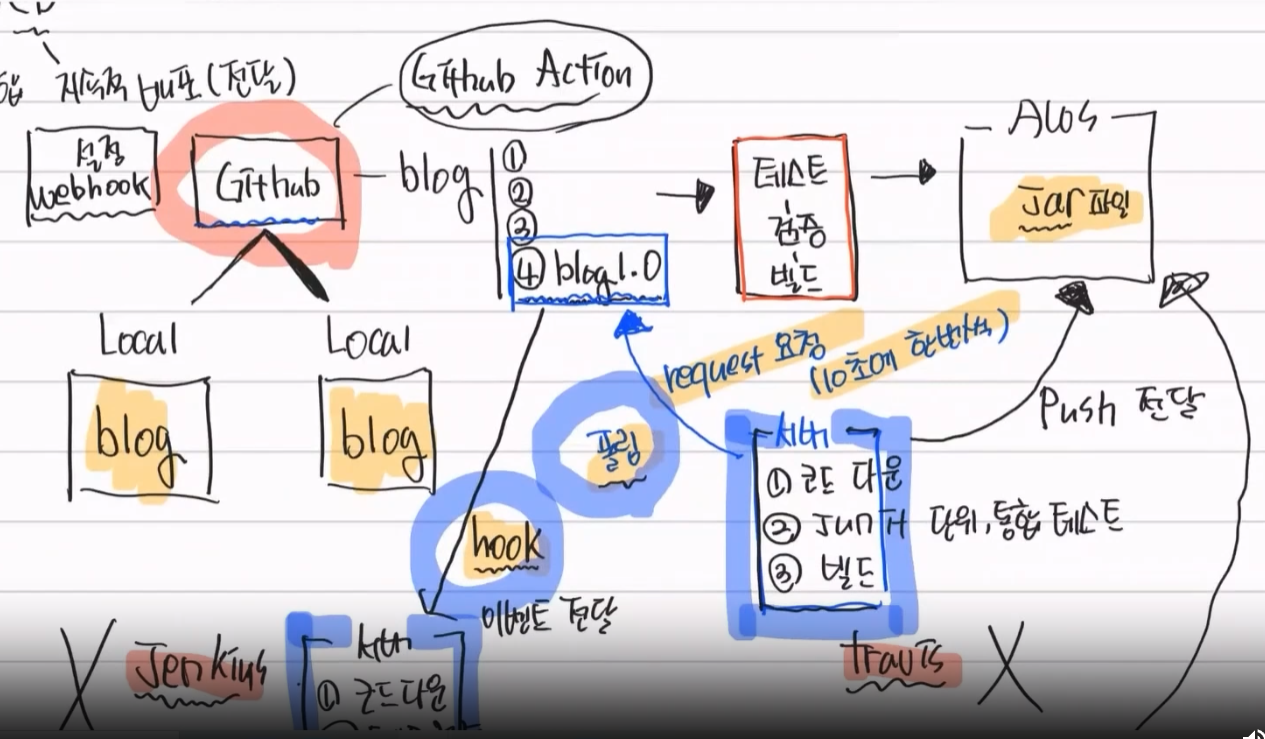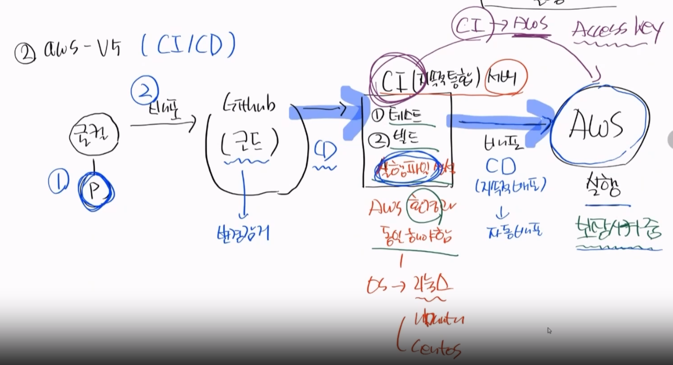 CI/ CD는 로컬에서 깃허브 배포 -> CI(지속적 통합) 서버(AWS환경과 동일해야 함)에서 테스트, 빌드, 실행파일 생성함