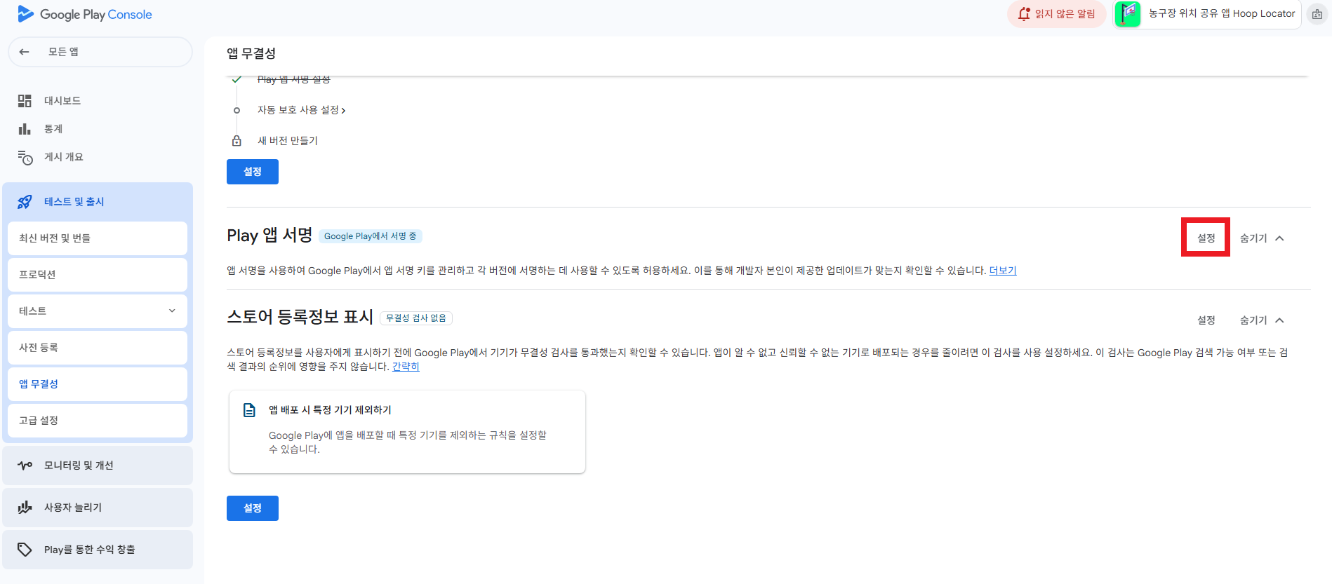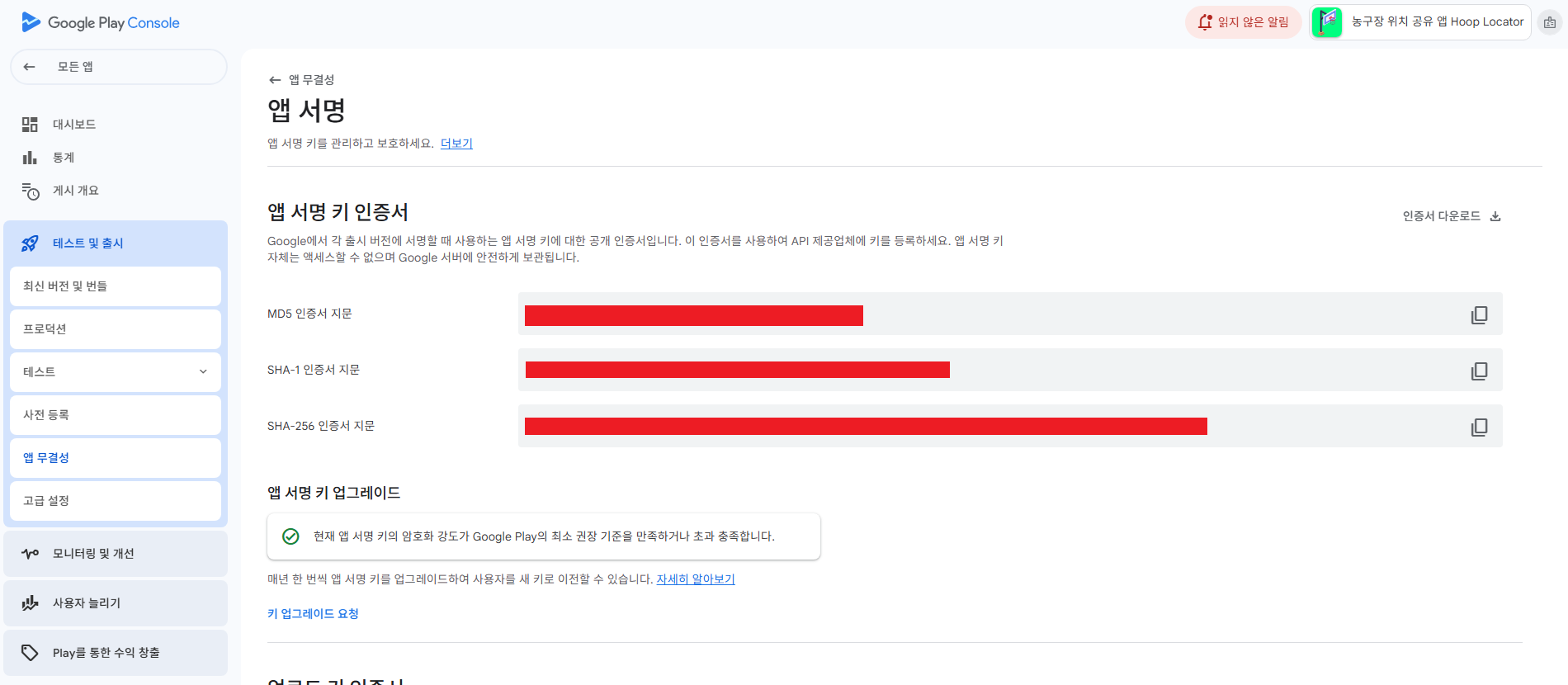 테스트 및 출시 -> 앱 무결성 -> Play 앱 서명 -> 설정(빨간색 박스 표시)버튼을 누르면, 앱 서명 키 인증서 키를 찾을 수 있다.
