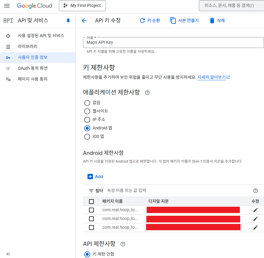 키 제한사항에 Android 앱을 클릭하고 패키지 이름과 SHA-1 키(디지털 지문)를 넣어주면 된다.